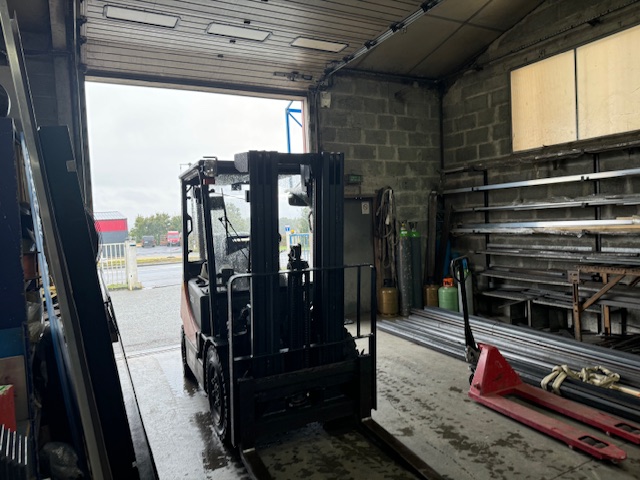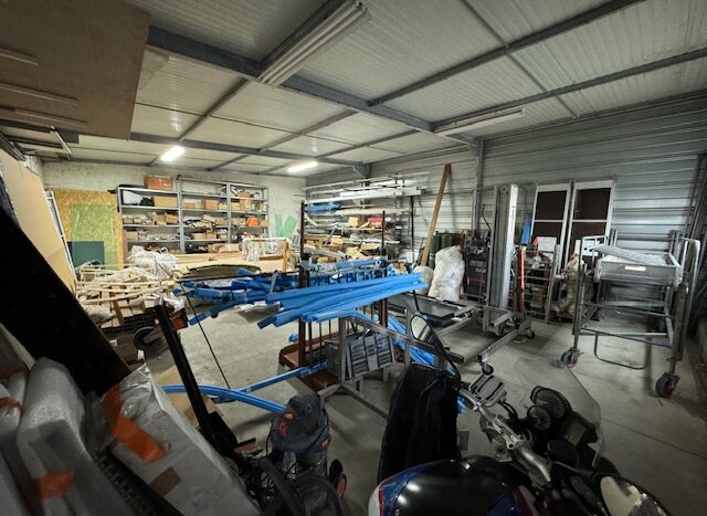Un bâtiment de 180 m² avec 3 portails en façade en bac acier. La taxe foncière pour l’année 2024 est de 3 347 €. L’ensemble se situe sur un terrain clos et bitumé de 2 500 m².