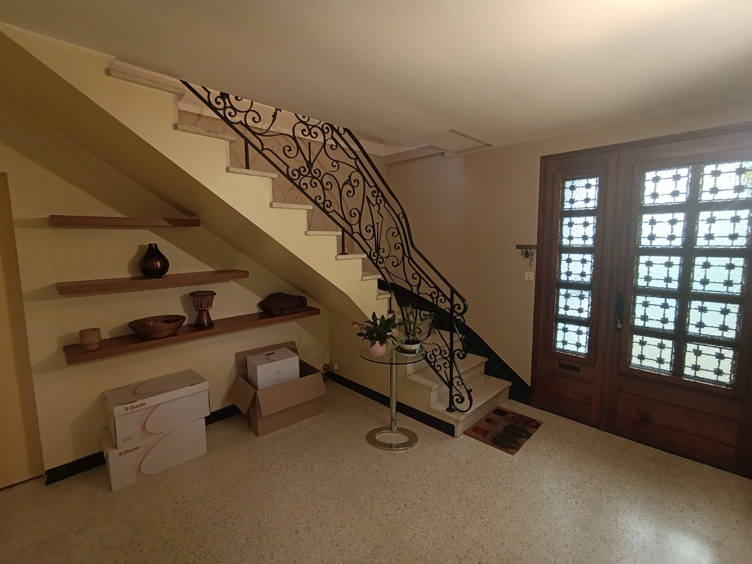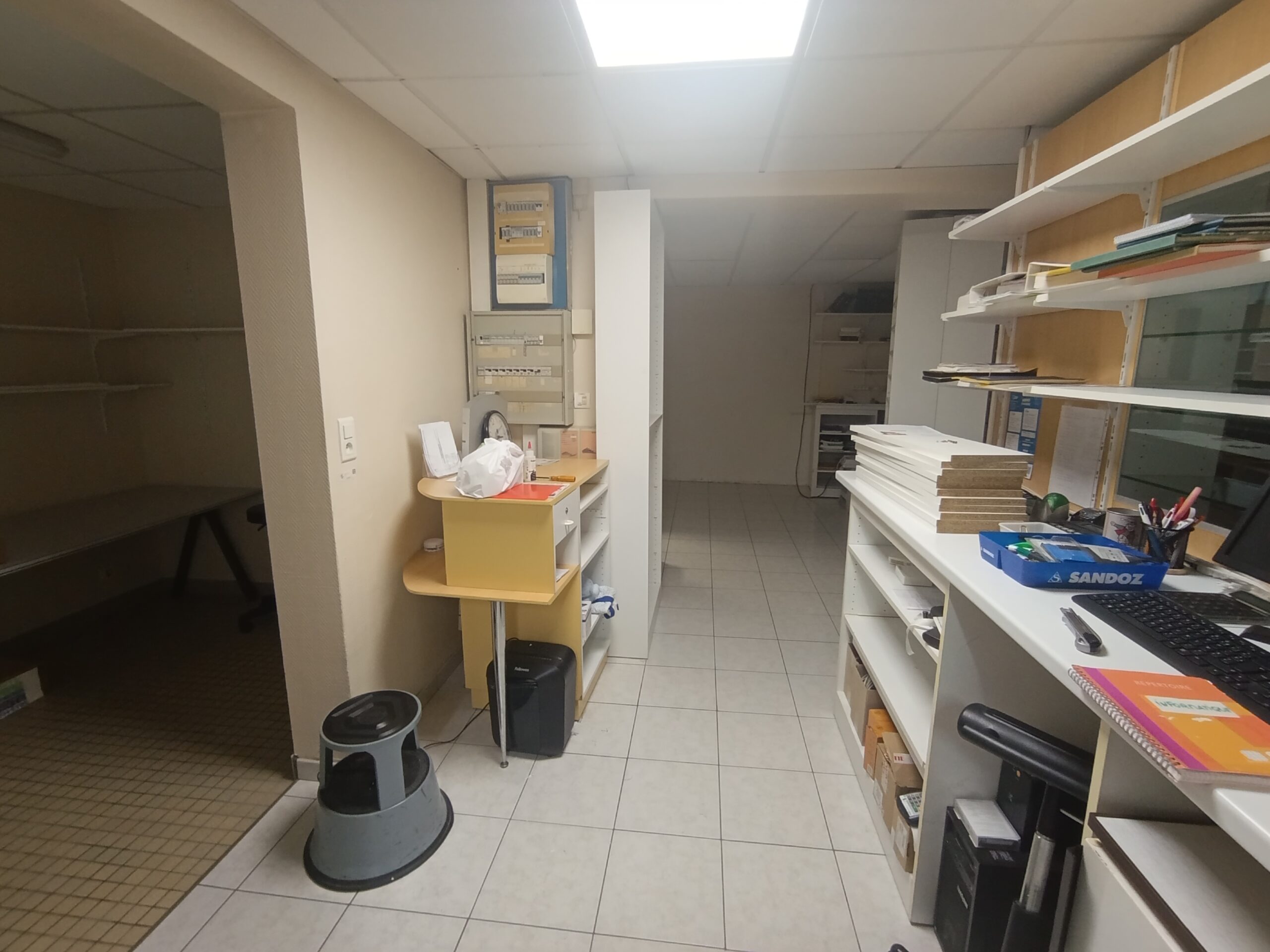 Le rez-de-chaussée se compose d’un espace showroom, d’un bureau, d’une arrière-boutique ouvrant sur le jardin, d’une cave ainsi que d’un garage équipé d’un portail.